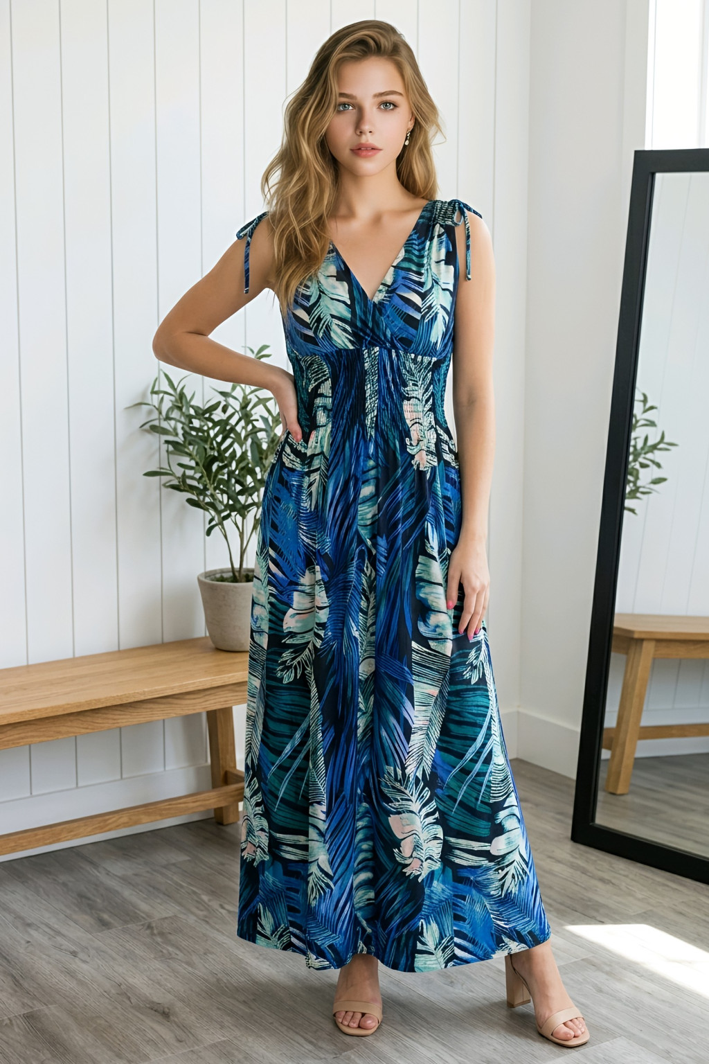 ÚJ AMINA levélmintás maxiruha - kék/zöld