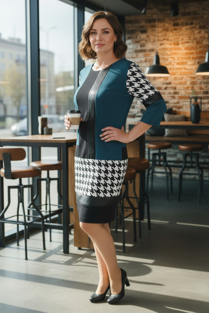 BELLA különleges fazonú, tavaszi ruha, amely kiváló minőségű, rugalmas anyagból készült. Elején a pepita betétnél rejtett zseb található