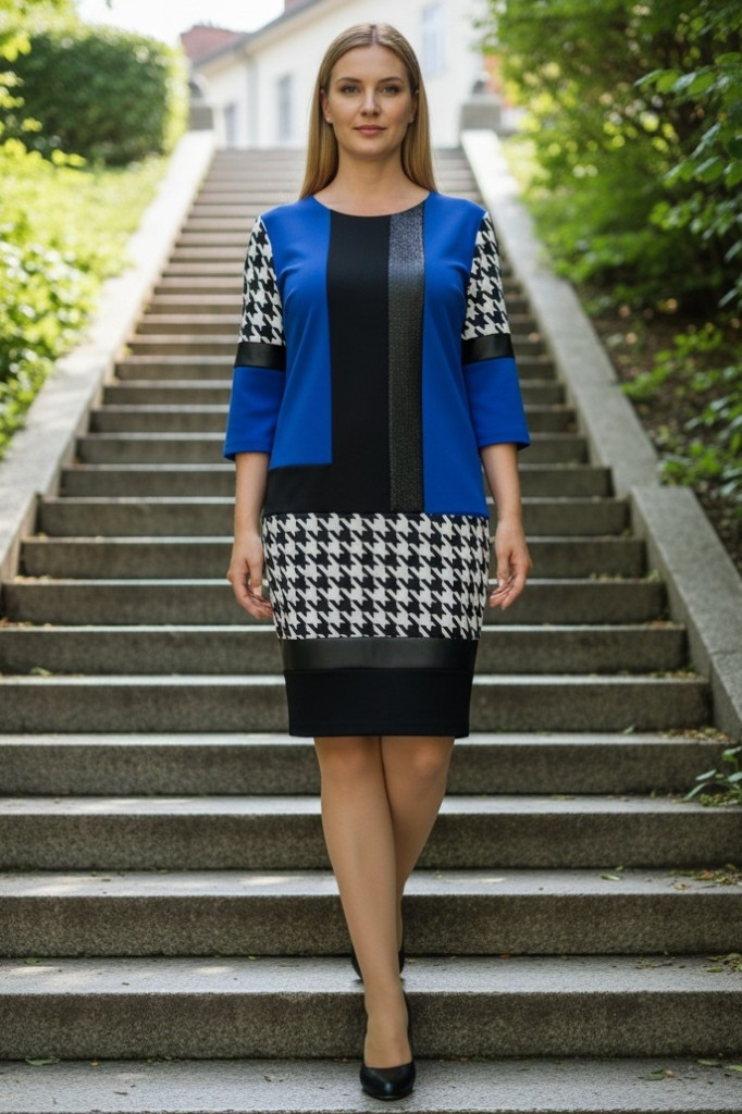 BELLA különleges fazonú, tavaszi ruha, amely kiváló minőségű, rugalmas anyagból készült. Elején a pepita betétnél rejtett zseb található