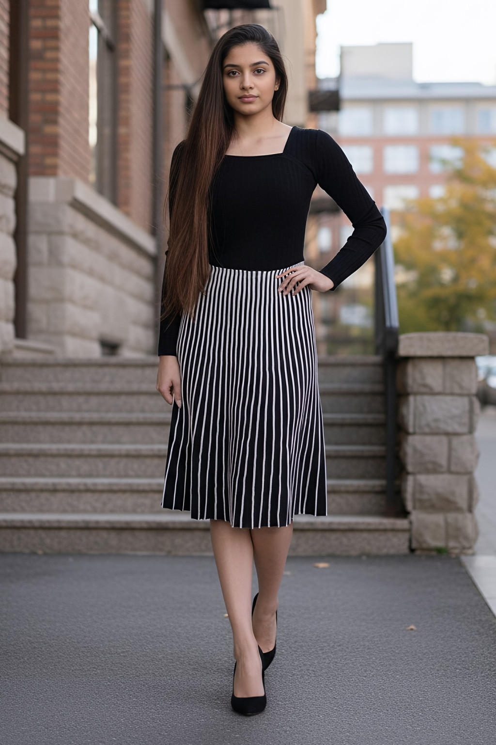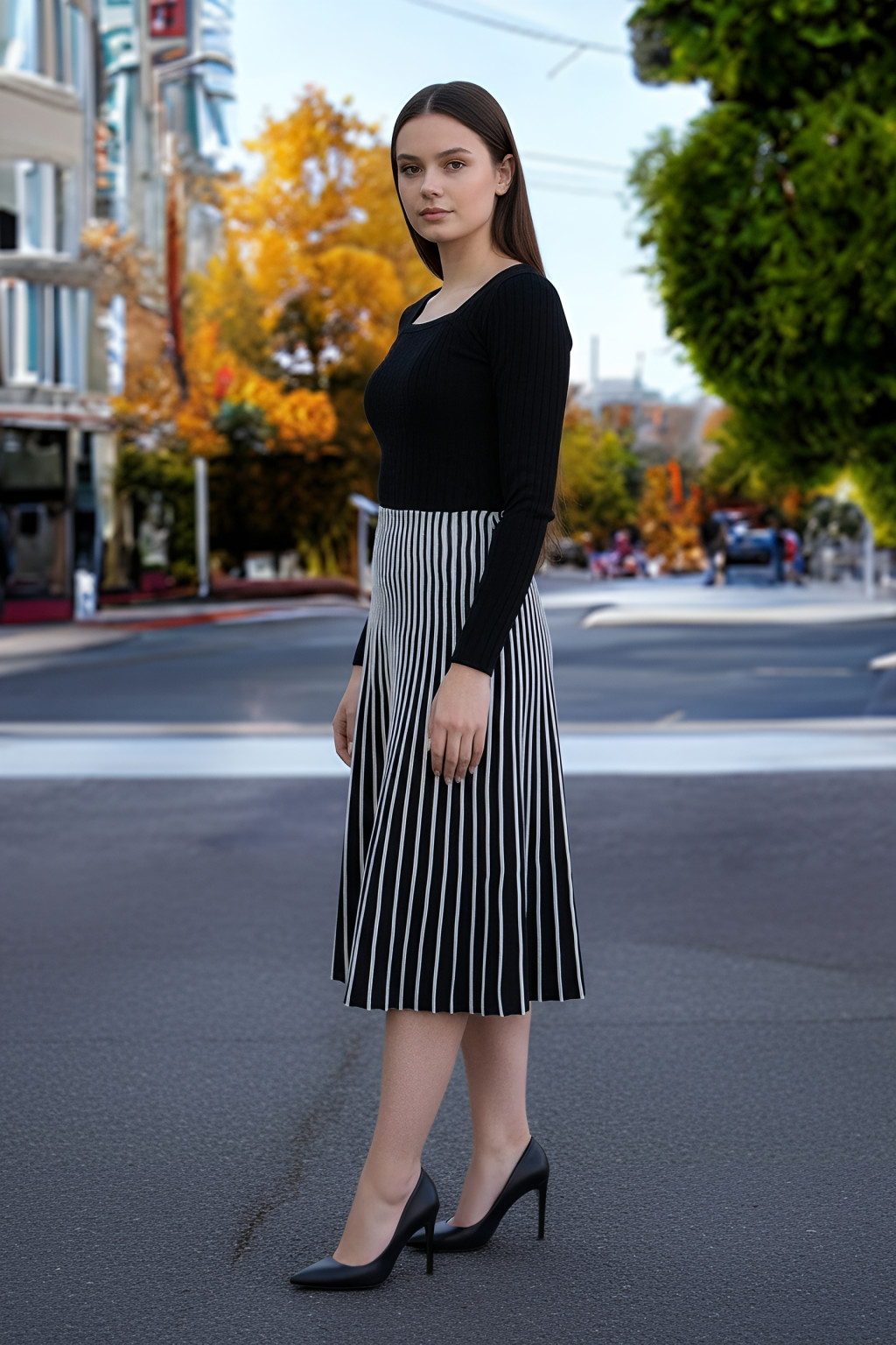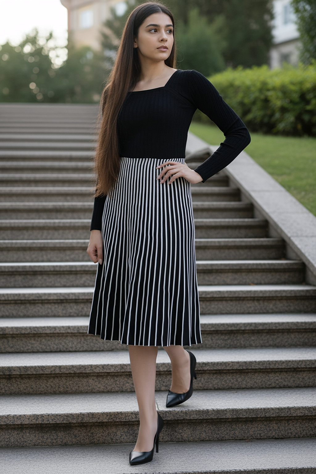 MAY márkájú különleges A-vonalú kötött ruha, amely csíkozásánál fogva karcsúsítja a viselőjét. Hátán különleges kivágással és masnival záródik.